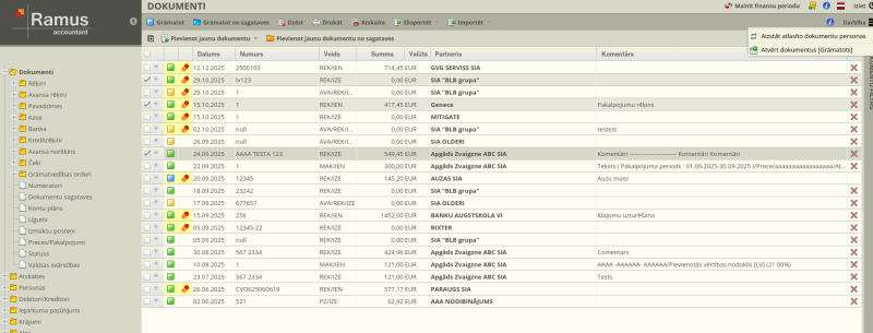 - Pārskatāmība: Reģistrā redzami dokumentu numuri, datumi, partneri un kopējās summas.