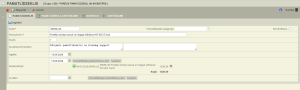 Sistēmas pamatlīdzekļu modulis nodrošina pilnu PL dzīves cikla uzskaiti — no iegādes brīža līdz pilnam nolietojumam vai norakstīšanai. Modulis ir integrēts ar grāmatvedības reģistriem, nodrošinot automatizētu nolietojuma aprēķinu un atskaišu ģenerēšanu.