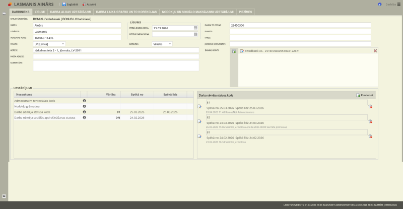 - Uzstādījumi: Tabulā tiek fiksēts darba ņēmēja sociālās apdrošināšanas statuss un nodokļu grāmatiņas dati.
