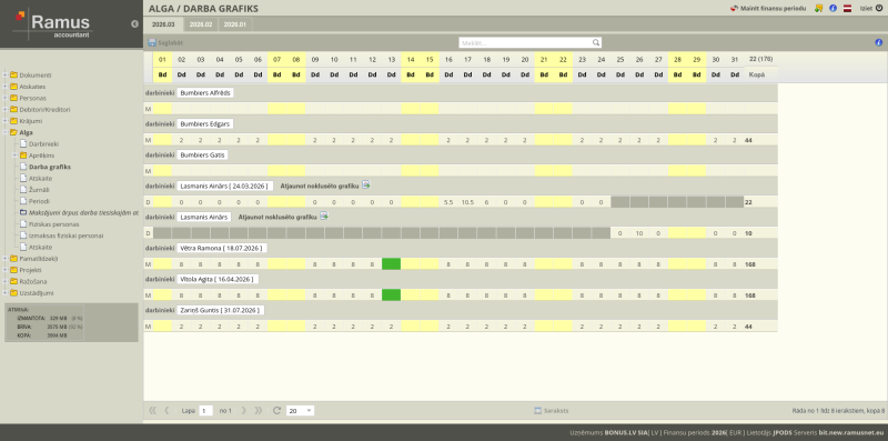 - Periodi: Sistēma pieļauj vairāku periodu reģistrāciju, ja mainās darba nosacījumi mēneša ietvaros.
